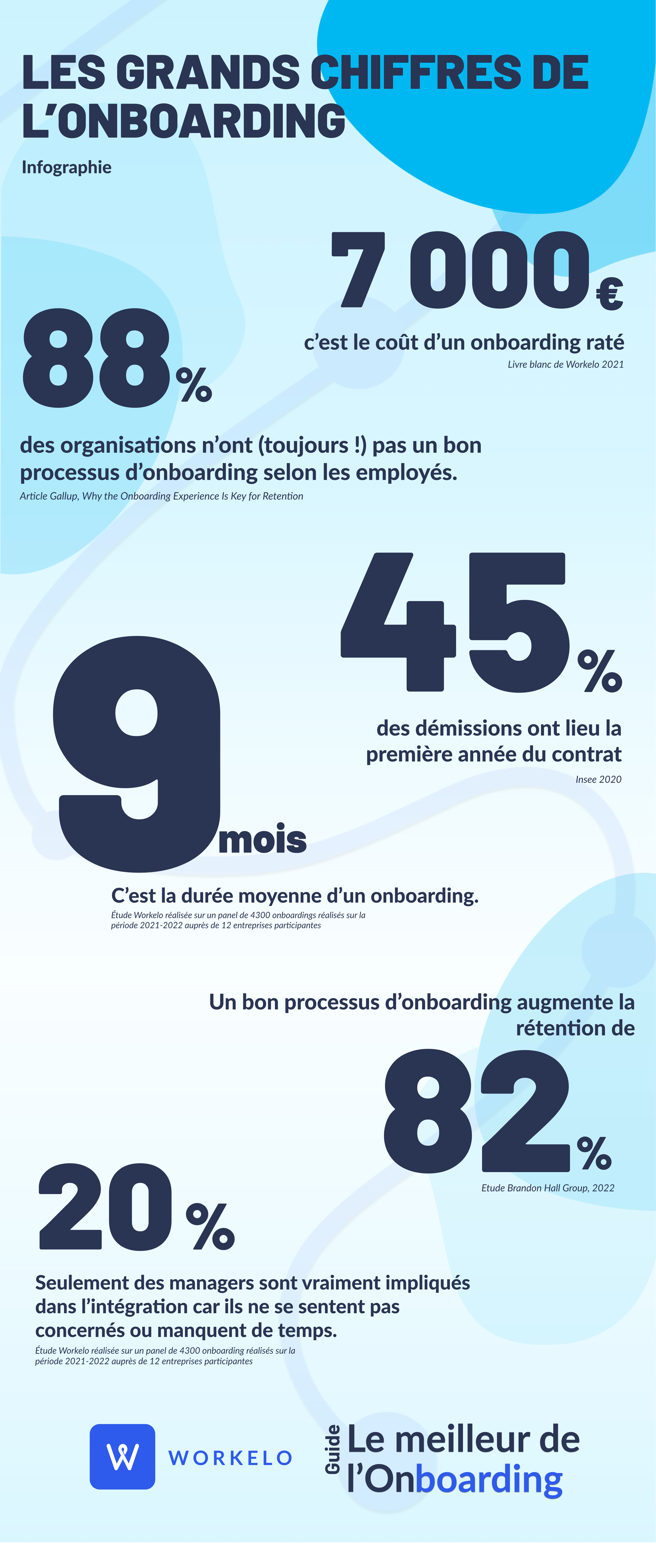 Parce qu’un parcours d’onboarding doit sans cesse être perfectionné pour s’adapter aux enjeux RH du moment, nous vous proposons une infographie sur l'onboarding pour connaître les dernières tendances d’onboarding et les chiffres les plus récents sur le sujet.