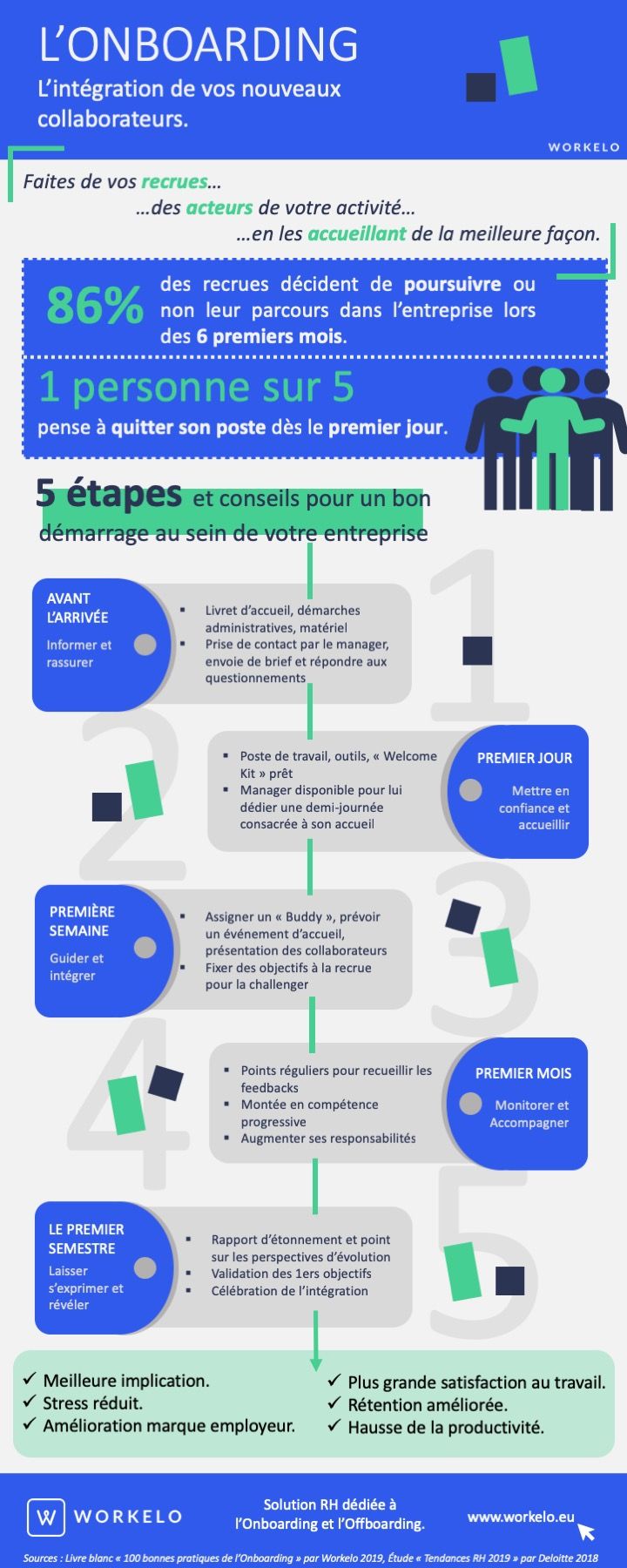 Un Onboarding réussi vous garantit une bonne intégration et la fidélisation de vos nouvelles recrues et limitera à terme vos coûts de recrutements. Découvrez les 5 étapes et conseils de Workelo pour réussir vos intégrations !